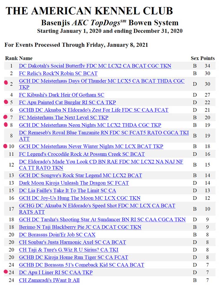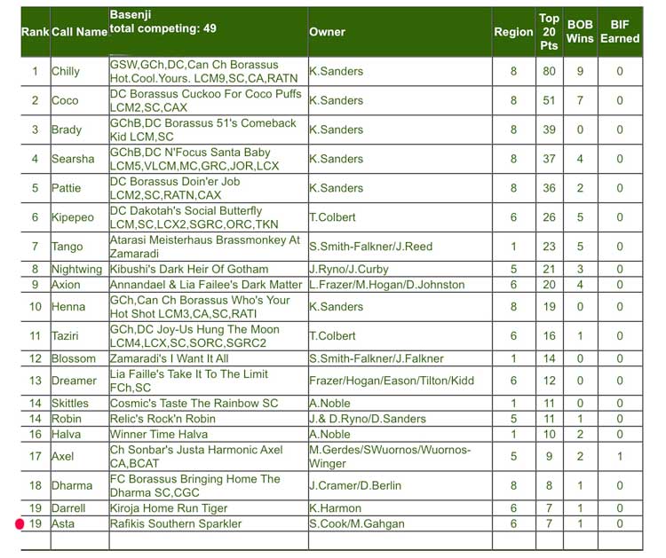 ASFA Top 20 Basenjis Lure Coursing 2020.