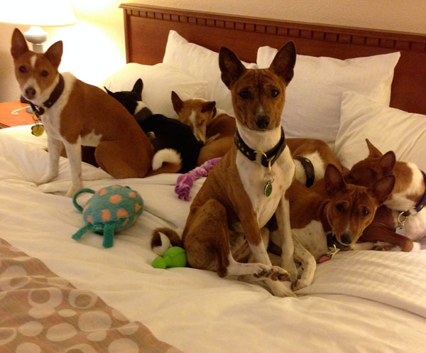 The Wrinkler is published quarterly: February, May, August & November. Deadline for receiving material for publication is the 1st day of the previous month. The contents of The Rip Van Wrinkler do not necessarily represent the opinions of the editors, or the membership. All rights to reproduce any part of The Rip Van Wrinkler® shall be done solely with the permission of the editors. The RVW Club is affiliated with the BCOA The Rip Van Wrinkle Basenji Club & Wrinkler ONLINE: www.rvwbasenjiclub.org As the Tail Turns About our dogs sleeping in our beds (& at hotels) Sue Schulz - This is why I let my dogs be on the furniture. Sleeping so peacefully. To me the question would be why wouldn't I let them sleep in my bed?!?! Kojak took full advantage of his Candlewood Suite last week. He did move over for me. Honest he did!