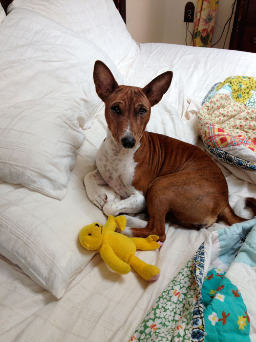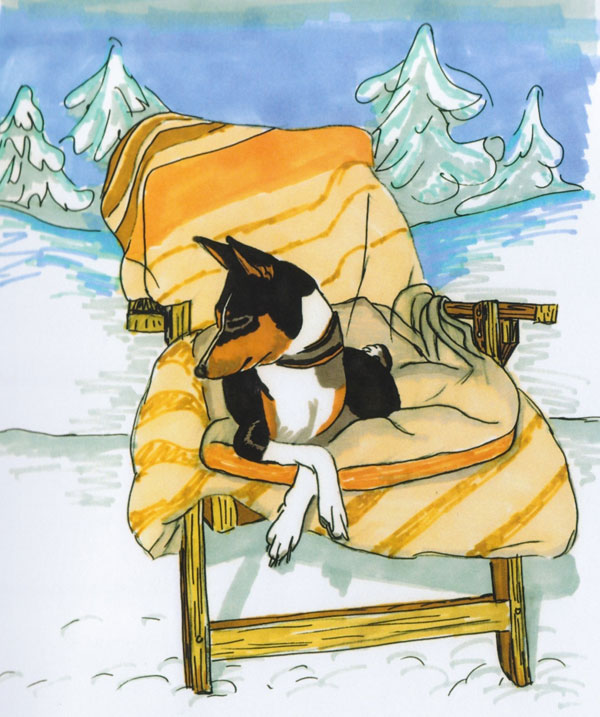The Wrinkler is published quarterly: February, May, August & November. Deadline for receiving material for publication is the 1st day of the previous month. The contents of The Rip Van Wrinkler do not necessarily represent the opinions of the editors, or the membership. All rights to reproduce any part of The Rip Van Wrinkler® shall be done solely with the permission of the editors. The RVW Club is affiliated with the BCOA The Rip Van Wrinkle Basenji Club & Wrinkler ONLINE: www.rvwbasenjiclub.org As the Tail Turns BEAR STORIES by Karen P. Christensen A little weeknight excitement here in the 'Burg: Amber and I were cued to a black bear VERY near to where we were walking the boys, by a kind driver who stopped to alert us. Turned our heads to look before crossing the street and the bruin was about 200 feet away, also crossing the street! We alerted a neighbor who went to look, then at the next cross street we again saw the bear, who thankfully took no note of us. We called 911 on Amber's phone and did see cops cruising the usually-placid neighborhood. I don't think the lads spotted him, though they were definitely sensitive to our level of alarm, and likely eventually scented the critter as well. We rushed to get a daylight walk in with the woman-dogs even though the bear was probably well out of our range by then. It looked like a young bear and like it was on a mission, though trash night could be a big diversion for a scavenger. by Susan K-M I thought it would be fun to repint this from August, 1997: In Which We Meet a Bear & Think He's pretty OK & He finds Us Agreeable Too If all you know of Woodstock is, like, "Woodstock," let me tell you that we are in the Catskill Mountains & there's a town named Bearsville just west of the village, out past the 'flats.' And the bears do come around especially when there is an extreme condition such as the drought we're having this summer. There are foxes & coyotes & lots of deer & raccoons & possums & all the rest too. I've set the scene, so-- Big Crash! I run towards our screened porch were the Bs were 'hanging' & TRILL & NINER & GEM came running in. "WE Have to go out NOW," they chorus. OK--So we all run the other way to my bedroom window which is their way to their fenced backyard (very large, rocks & hills)--Up on the chest & out the window they go, followed by Hip Hop, Calliope & even SOPHIE, who at almost 12 needs a wee boost up--don't tell her I told you--promise! So, Picture this---THEY'RE ALL RUNNING OUTSIDE--& I finally go back to the porch to finally discover WHAT'S UP! There's a Large( for a Black BEAR anyway) bear smiling at me 'cause he has just overturned my l4 year old garbage dumpster & has sunflower seeds sticking to his flews 'cause there were 50 pounds of them in there. OMYGOSH! SO I run back to the bedroom window & do my sweetest, "pup pup pup pup--" & stick my head out 'cause there's no COMMOTION & THERE THEY ALL ARE, 4 at the fence (only 4 ft. high), nose to nose with SAID Bear. Hippy & Calliope, who must be wise in BEAR FACTS, standing sentinel on a large rock. OHNYOHMYOHMY! In the back room I run, get "cookie" jar, open wee back door, & whisper, "Cookies...." Never did understand the sense in screaming these things & they all trot in. "YOU CALLED, MOM? " I said, "Sit.." & they all did--always for a "cookie!" Tomorrow I'll deal with the remains of the bear's feast & now I'll go back to Monday Night (Preseason) Football. All's well with the dogs who think football is boring except when the 49ers are playing. Susan & the unwoofs Holley Olsson