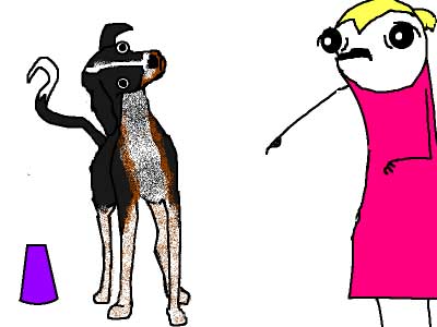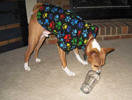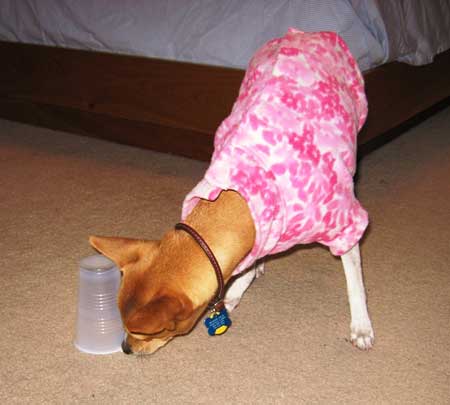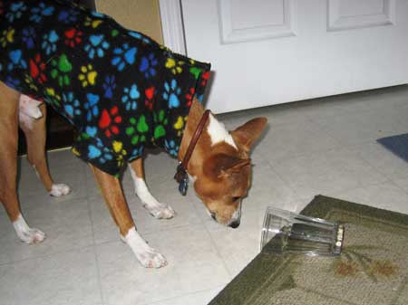 Karen Christensen's Tutu Tutu immediately chose the plastic lid & carried it off to chew. Kirsten Sigrist's Ariel I was trying to do Tessie, our labradoodle first, but Ariel butted in. You Tube - Basenji vs Labradoodle Andrea Stone's Regan & Zepar Regan kicked Par’s butt on the lid. Maybe it’s just because her teeth are smaller. Zepar is such a funny, soft dog. I do adore him. I must say I was VERY proud that Zepar stayed at it as long as he did. He has always been such a giver upper. Shows that working with your dog and teaching them that they –can- do things pays off.YouTube - Peggy Pick's Ivan & Dasa The treat under the jar trick was illuminating and revealing. It revealed that I’m very well trained. I showed Ivan the treat and then put it under a plastic storage container on the carpet. This posed no real difficulty, as he was able to scoot the container over the treat and gain access. I then tried a tall cylindrical container. This tipped over fairly easily and his attitude about the whole thing became more enthused by the minute. I then tried a sturdy drinking glass. This also tipped over with minimal fuss. Ivan was happy to try any type of container I wanted. These science experiments are fun, Mom. Dasa was content to nibble treats from the hand behind my back while we were in pursuit of excellence and expanding the body of knowledge, as it were. Then we moved into the kitchen with the sturdy drinking glass. While I praised his efforts, Ivan pushed the glass along with his nose. It scooted across the floor. He looked at me as if to say “hmmm.” Then he pushed it to the edge of the rug and tipped it over. I tried this again, and he pushed it straight to the rug and tipped it over, this time with no side trips around the kitchen. Later when Ivan was downstairs napping, Dasa and I tried this test in the bedroom. I used a lightweight plastic cup over her treat. I showed Dasa the treat and then put the cup over it. She tilted her head and looked at me. I kept up a steady stream of encouragement as she pushed the cup across the carpet. She stopped and looked at me. I picked up the cup and treat, once again showed her the treat and put the cup over it. At my urging she pushed the cup around a bit more, clearly humoring me in this waste of time. She stopped and sighed. I showed her the treat under the cup again. She pushed it over to me, sat in front of me and placed her little paw on my arm. I immediately gave her that treat and several more, apologized for putting her through this exercise, and told her she’s brilliant. Dasa humoring mom.