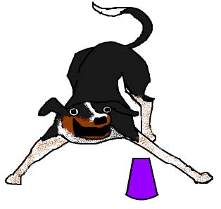 Susan Kamen Marsicano's M & Fern YouTube - Lids & Weaves, Disney Music, treats under lids, weaves..... Peggy said, "The treat under the jar trick was illuminating and revealing." I found that myself and was, in fact, surprised by how each dog reacted to it. Here are 2 out of 3 getting it. The boys each politely sat a small distance from the offending object, wanting me to solve it. Donna Hess' Nora I don't know how the other dogs are stacking up, but I think my Nora is a genius. I put a treat under a plastic cup (not clear)...she looked at me as if I was simple, whacked the cup with her foot and ate the treat. Then she sat down and waited for me to do it again. The next test was I put a treat into a closed container. She picked up the container, took it to "her" coach and chewed it open!! Anything to do with food is OK by her! However, what was even more interesting was the treat ball. In the bottom of the dog toy chest I have one of those balls that you fill with small treats and the dog has to push it around to get the treats out. None of my herding dogs ever cared for this toy, as you have to push the ball around quite a bit to get the treats to fall out. They get bored in two minutes and move on to something else. I tried it with Nora. She was fascinated by the ball and pushed it around for over twenty minutes until all the treats were consumed. I have given her the ball everyday for two weeks and she stays with it until it's empty!!