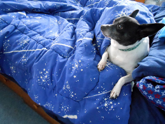 Bella Fuller, a little rescued rat terrier, has lots of mats and beds to choose from in different rooms. However, her favorite is Veronica's bed.
