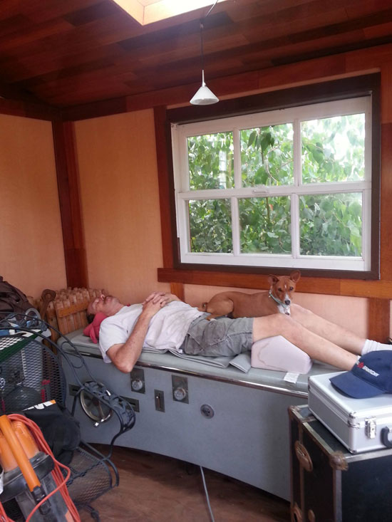 Dennis Allen on the spinalator in the shed. Tippy hanging out going along for the ride.