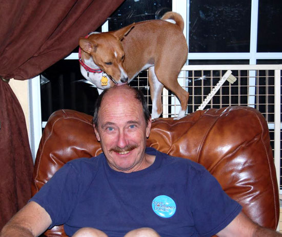 Dennis Allen HOW I LEARNED ABOUT BASENJI'S. I was working for a guy painting and plastering and fixing his rentals. He had three house's all next to each other. While I was scraping paint on the middle house. I heard some scuffling behind me, and on the other side of the fence, that ran around the first house, a group of smallish dogs had appeared. They were all Red and White little dogs with wrinkled brows, pointy ears. They made me think they were wondering, "what is that weird guy doing?" They would follow me along the fence. They were very quiet except for a yip or a little snorfle, as if they were saying, "You are in my space and I can not see what's you are doing!" They would follow me up and down the fence line most of the day except to go get a drink of water or take a poop. They ran so fast considering their size. When I ate lunch they really watched me carefully to make sure they missed NOTHING. The person who owned them came home early one afternoon and explained what they were and how they acted and why so quiet. She asked if I wanted to come over and meet them. I jumped the fence and met them and they all wanted in my lap after sniffing me very carefully (I think we had two Airdales at the time). She explained the voice box thing and the history behind the breed. She said she was going to breed them. She took them to vivsit on the weekends to Palm Desert to a friend who also was a Basenji person. When I worked on her house they followed me around and got into everything I was using. I spent a lot of time chasing them down to get back paint brushes and paint scrapers. Anything with a wood or plastic handle were the hot items to steal and run away with. Half the time the littlest one would grab and run without me hearing anything. When the rest ran off I knew to look and see what was missing, and go find it chewed up a little, or one of the others would take it and run off somewhere else! I would spend more time chasing with them than working some days. The first house was so old that it was lath and plaster inside. I was on a ladder plastering and the littlest one was standing on the first rung waiting for me to come down, I guess. Inside you would hear the rush of toe nails when they would start the racing around the house. They always ran on the some path, except during a chase, some one would cut the course to catch the leader, or become the leader. It was great to watch their antics and racing around. I have not thought about this in a long time, it makes me smile think how much fun they were to watch and play with. I need to go hug our bunch now. That was thirty years ago - maybe more. When Tamara and I wanted to add a dog to our home, I remembered those little guys. And that’s how our own personal basenji addiction began...