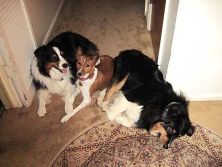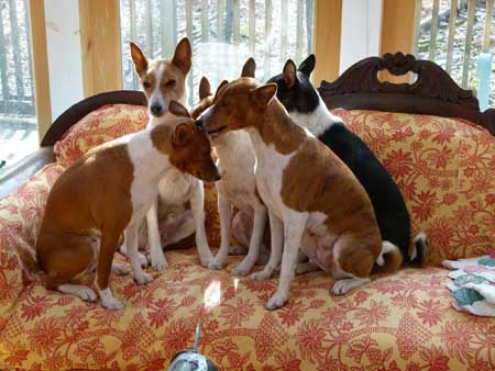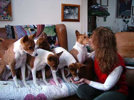 KISSY FACE? Marcia Woodard asked for memories/reactions to Basenjis licking their humans. Here's some of what our RVW members had to say:Andrea Stone I like it in moderation. Turkish will lick the bottoms of my feet in bed, which I kind of find relaxing. Gage will groom me until I ask him to stop - my ears, neck and face. I let him do it for a minute or two because I think it's sweet, but I get bored. He has a very rough tongue. Regan, Pha and Zepar like to give me kisses which again, I think is sweet but I get bored if they want to go on to long. I think they are checking what food I ate last. Same went for Boo, Delphi, and Shane. Kip gets a major grooming every night at bedtime from Regan, and Turkish grooms his (extremely short) hair - he will even pull it. He has done this to guests too, even once going so far as to pull a friend's pony tail. He does not groom my hair. Brenna used to REALLY give Kip the once over, even licking up inside his nostrils if he let her! She especially liked grooming him after he shaved. S K-M My Poet dog, in 1977 or so, first dog in the ring, in Bred by, gave Anna K Nicholas a big slurpy kiss, and then ate her carnation. ?? Anna K said, “ I told them I don’t like to wear corsages.” And then he won. Karen Christensen and then when I showed Laser to her he schlurped her - her face was eye level to his stack on the table - and she said he was a sweetie. As he was. S K-M - can you tell about meeting Calliope? Karen Christensen Oh, dear! Of course I first met Calliope when I got my puppy (Laser) in early May 1998 but a couple months later you told me you had entered Laser in the BCOA Specialty in Rhode Island and said we could share a room. The second night (Obedience I think) I was not feeling great so (tried to) return to the room early - I did sidetrack to let Midge Greenlee admire Laser - and ignored all your crated dogs as I settled into my bed with my little love. You came back not much later and proceeded to walk your 6 in pairs and let each pair to settle at will after their walks. Of course their choice was to settle on my bed, so by the time the last pair was released 1) no more space on the bed and 2) bunch of dogs lying on top of the bedding made it impossible to move my arms. Calliope, wanting a spot, found one by planting her girly bits on my forehead, facing my feet! After a few minutes of surveying her view (and of me cracking up laughing while I enjoyed my view of her bellee) she dismounted my head and turned around, and decided my face was in need of a wash. and wash. and more wash. While many basenji tongues are very soft, Peachy's was a bit abrasive, and so I enjoyed my first of many Peachy dermabrasion treatments! I had no choice - the other Apu's did not move and I was defenseless.
