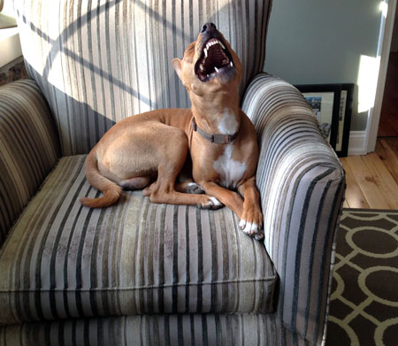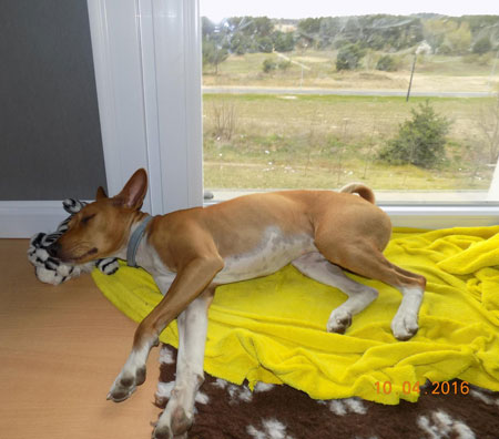 April 12th, 2016 Hi Susan Ray is not in a rush but would like to find a healthy Basenji who is not too old who needs a great home. If you have anyone or know anyone with a Basenji needing a home, please let me know or call Ray at 912-222-1464. Ray’s email is Raymondcolglazier@gmail.com. Any help finding him a new buddy would be so appreciated. THROW-BACK FEEDBACK A Sense of Propriety, by Debby Mayer Lulu hasn’t spent that much time in hotels or motels . . . more pertinent to her experience is our home in Hudson, where she has now spent half her life. Downstairs consists of three large rooms: the music room; the middle room, where we hang out; and the kitchen/eating area (we both eat there), with a WC and laundry roomette. These are the Public Rooms. Upstairs are the Living Quarters, consisting of the bedroom, Lulu’s room, bathroom, dressing room, and my office. For an inordinately long time this spring/summer, we’ve endured a partial renovation of the upstairs bathroom. This requires large men to arrive at 8 a.m. and tromp up the stairs, through the bedroom and the dressing room, to the bathroom, where they’ve replaced the tub and tiles and repainted the walls. Lulu, I’ve realized, is horrified at this breach of our quarters. I mean, she’s ten, and she has a strong sense of propriety, which, in her eyes, I lack. The men are perfectly nice and have their own dogs at home, but still. She stares at me, demanding to know why I allow this to happen: Have you no pride? She dogs my steps, afraid that I might possibly leave her in charge of the situation. The worst days are when we have to leave the men upstairs by themselves and go to the office (like me, Lulu is a woiking goil). Returning in the evening, we both rush upstairs, me to check out the work, Lulu to search each room, confirming that no intruder remains.