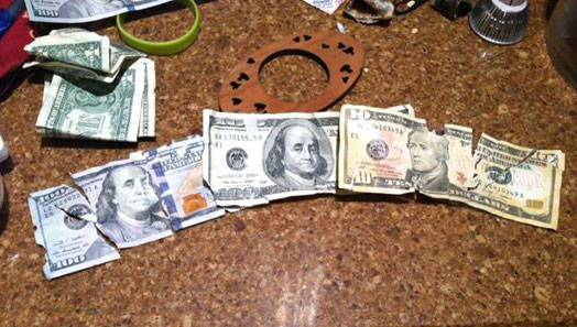 S K-M: So Gilda - where is the lower left corner of the twenty? Actually this is not as bad as it looks, as she took the bills out of my cross body, which has cards & my drivers license, & other stuff. Never touched the leather bag. Not a tooth mark. Just did these. She's hiding although I said not a word. Remorseful I'd say. Karla Kraus Schreiber Haven't had that here in many years, but I can't say it doesn't bring back memories! Susan Marsicano And she took the bag to the daybed. Just opened it and removed the cash. Ha! Laura Gold Great minds think alike. Violet was only 3 months old when she did this.