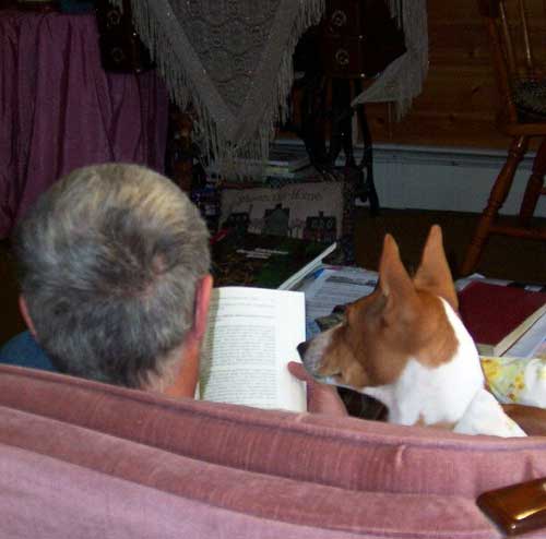 When out in public, Hank was the model of decorum and I was accused numerous times of creating stories that surely couldn't be true----ha!! When we shared a room with new acquaintances at a National Specialty, in the middle of the night, they learned first-hand about the antics he could pull while people slept. Oh, and the time we visited a basenji friend (Anne Nored) up near Dallas. Imagine my horror when I awoke the morning after our first night there only to find the room full of bright green "fluff" that he had pulled out of a couch cushion as I slept............baaaaaaad Hank.