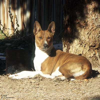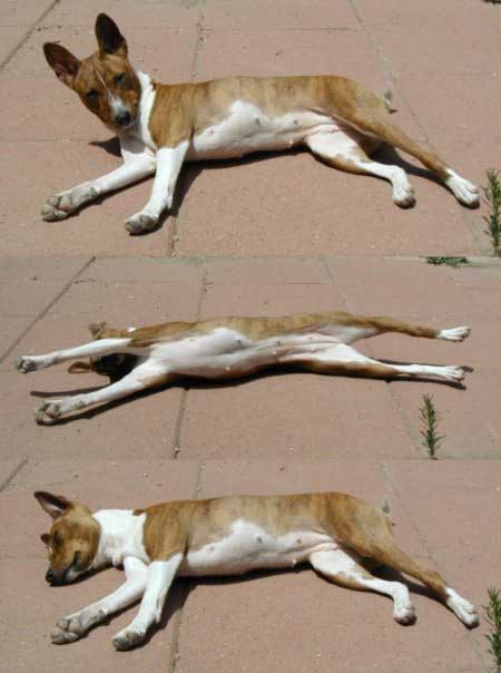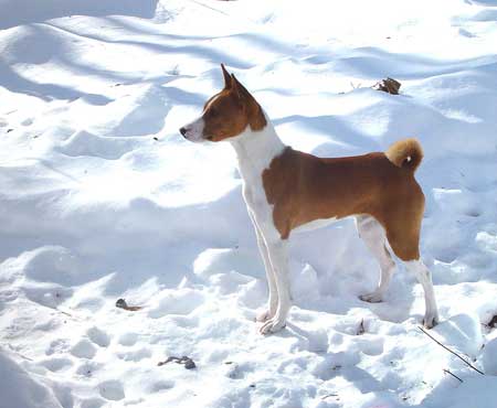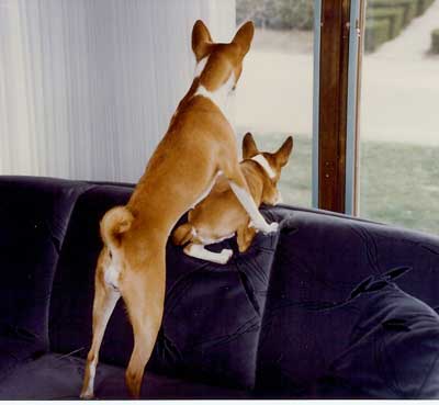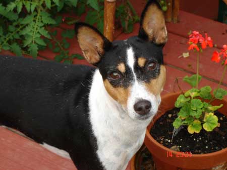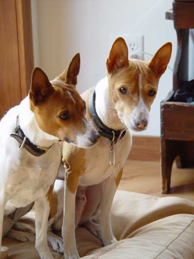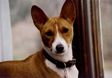 As she did with everything, she handled the whole ordeal with dignity and grace. It was a long, slow process and we sustained her for a few months on daily subcutaneous fluids and shots of pepcid but she withered to 14 pounds and began to have seizures. She had bouts of total confusion and blindness and we finally made the decision to let her go. I still cannot write about those last two days and letting her go. We miss her terribly. Reno does too, although you can imagine how we now dote on him!! He is now almost sixteen and incredibly sweet in his old age, as Tess was. We are savoring each day. Tess came to us in 1994 as a wee pup at 8 weeks old. I can only describe my connection with her by saying that we “recognized” each other. From the moment we first made eye contact her expression of impish playfulness captured my heart. I have always felt that she was one of those things in my life that was just meant to be. When we brought her home, we turned her loose in our large den and she ran with abandon, bouncing off the sides of the couch because she was too small to jump onto it. She continued to run and bounce for some time and the look on her tiny face was sheer joy. It was as if she knew that she was home and her jubilation bubbled over into us and filled our hearts. It stayed for sixteen and a half years. Tess was extremely smart and fastidious and she house-trained in a snap. Our house held ample proof of her basenji-ness with chewed pillows and cushions, plucked carpeting and gnawed furniture. We learned that clothing was left lying around at its peril and bitter apple became our friend. By the time she was nearing a year old her playfulness was becoming a bit much for our three cats. We began to realize that she needed a playmate that could meet her on her own terms and of course it had to be another basenji. When we brought Reno home as a pup we were naturally nervous that she would accept him and get along with him. We needn’t have worried! She treated him as if he were her very own pup, cleaning his ears, snuggling with him and teaching him the ropes. She showed him the finer points of “hunting” prey through the front picture window and chasing squirrels in the backyard. Unfortunately, their dynamic changed as Reno matured and began to assert himself. Tess handled it all with self assured grace and rarely quibbled over toys and such. It was interesting that she simply chose not to challenge him on many things because it was clear that she could kick his butt if she wanted to. |