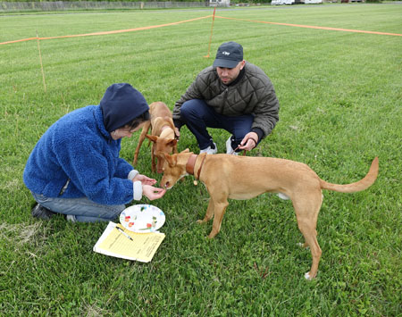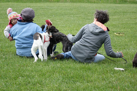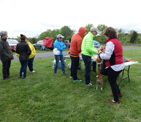 Donna Hess with Sunny, who is saying hellos to her "suemaw" (breeder). Our potluck vegetarian lunch was the Very Best Ever, even though the weather was not. We were joined by friends from the race meet. And Cybele scanned the table on tippy toes.