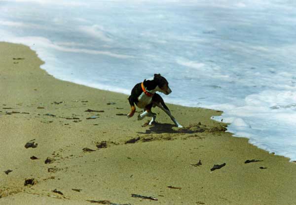 It was leap of faith time. I loaded everyone into the car and we went to the local dog beach. I freed the dogs one at a time leaving Bubba until last. The dogs were running up and down the dunes chasing sandpipers, bugs and each other. They came back nicely as a group when I called, then would return to play tag with the waves. Low tide is the best beach time with the dogs. There are so many interesting things to sniff and scratch and they could dig holes in the wet sand.