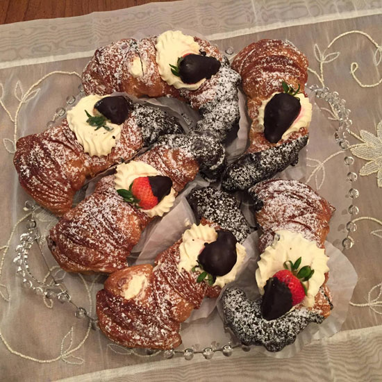 "Lobster tails" --- Super sized sfogliatelle filled with a mixture of half whipped cream, half custard, topped with a chocolate-dipped strawberry.