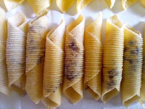 Unfortunately, the rosemary flower is very small and does not have an identifiable shape when crushed, so it has simply stained the pastry. During cooking, these stains have even disappeared. I cooked in a pan with some water. Once the sausage was cooked and the water absorbed, I raised the heat and added a glass of red wine. I continued cooking until the wine has shrunk, disappearing almost completely and has colored the sausage. Once the pasta is cooked, I drained it and poured it into the pan with the sauce and added a nice piece of butter, stirring quickly. CONSIDERATIONS As already written, the rosemary flowers have disappeared, but the aroma and texture of the sausage, rosemary and red wine sauce really surprised us! If you want to try inserting flowers into the pastry, try with clearly visible petals or corollas but remember that the green part could break the dough.