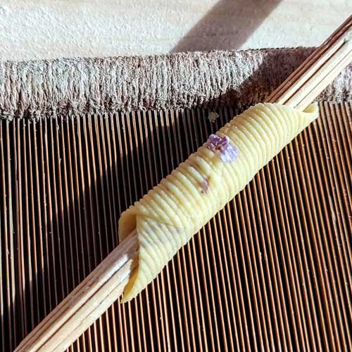 Garganelli with rosemary flowers dressed with sausage sauce, rosemary and red wine A few days ago I felt like trying to make egg puff pastry with flowers inside. I did a test with rosemary flowers but the result did not satisfy me. On the other hand, I experimented with a very simple but really good sauce. In hindsight I recommend that you use rosemary flowers simply to decorate the dish just before serving. INGREDIENTS PASTRY: SAUCE: METHOD Knead the pastry and let it rest on the cutting board for 20 minutes covered by a bowl. Roll out the sheets to the penultimate thin thickness then distribute the flowers evenly on one half then fold it in half, closing it and applying a little pressure. Pass the dough to the usual penultimate thickness then sprinkle it with a little flour and proceed with the last thickness, the one that will make it thinner. Then cut the dough for the format you prefer. I made squares 1/4 of the width of the sheet and with the comb and the stick I formed garganelli.