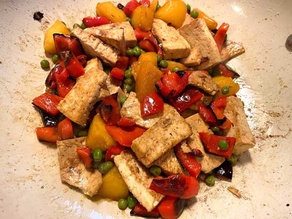 S K-M - Red peppers, peaches, peas, with tofu. Tofu was marinated in red vinegar, Shoyu soy, and sesame oil. Just so pretty!