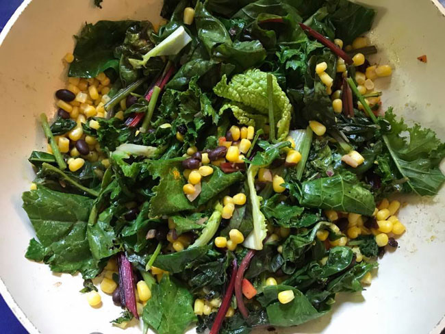 Add braising greens (kale, chards, mustard greens, spinach, turnip greens, beet greens, etc.).