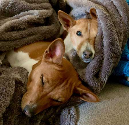 | Ashley Lorin How do three dogs fit into one spot on your lap? They improvise.