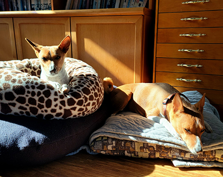 Tamara Allen Stella tucked in and Tippy sprawled out bathing in the sun. It's the only bath these two like.