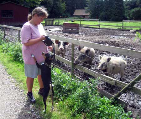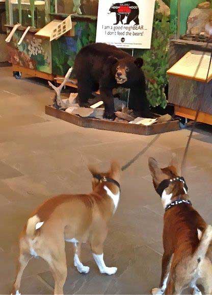 Chris Maxka IN WHICH the boys meet a Bear! Note the dogs have "Mohawks"! Trust me...they were NOT about to attack! Tebow's body language is "FEAR." I couldn't drag him any closer for a better picture.
