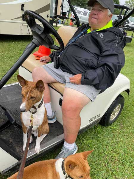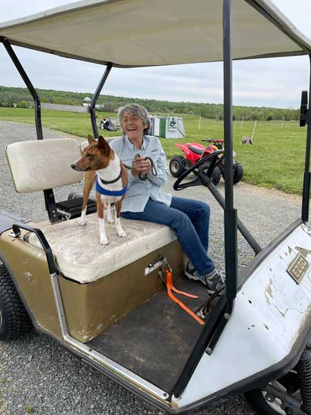 Sally Wuornos Basenjis much prefer to do it their way. S K-M Leaf found he loves golf carts at his first LGRA meet. He wanted to go home with Winnie Powers and the salukis. He hitched a ride at a breed show too - found another golf cart to hitch a ride on. Thanks, Penny, for being such a good sport. Yes, he got up there, his choice. Andrea Stone Gage and Pha took right to riding on a golfcart when we were in Idaho.