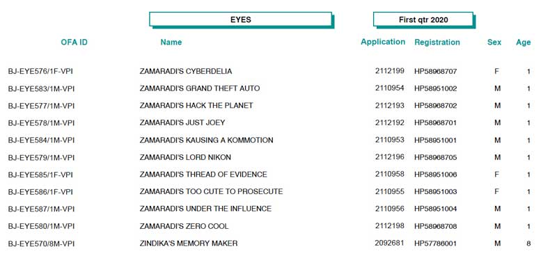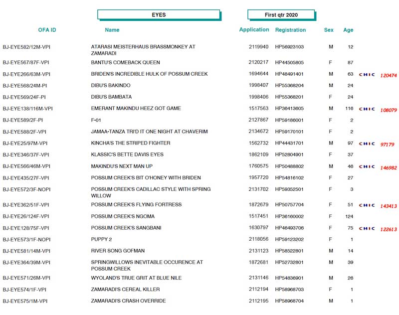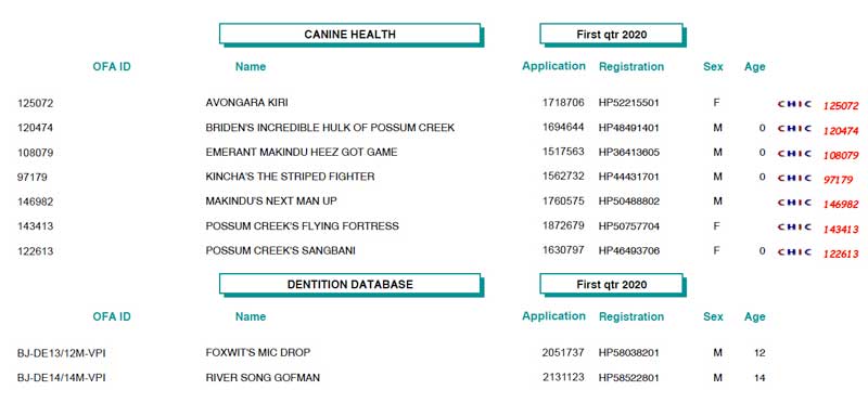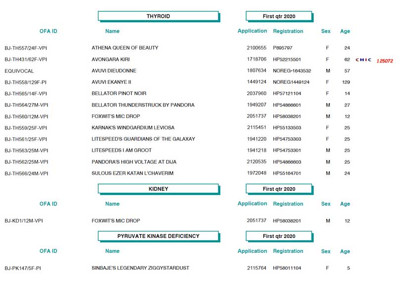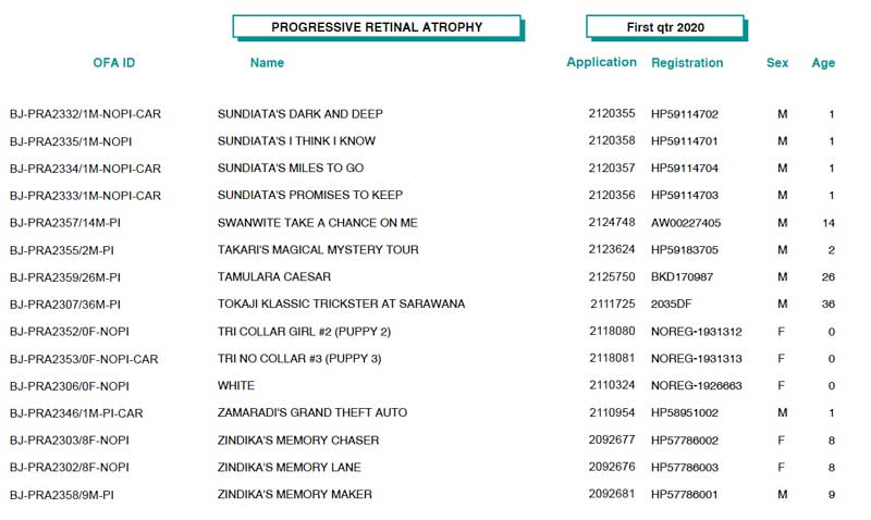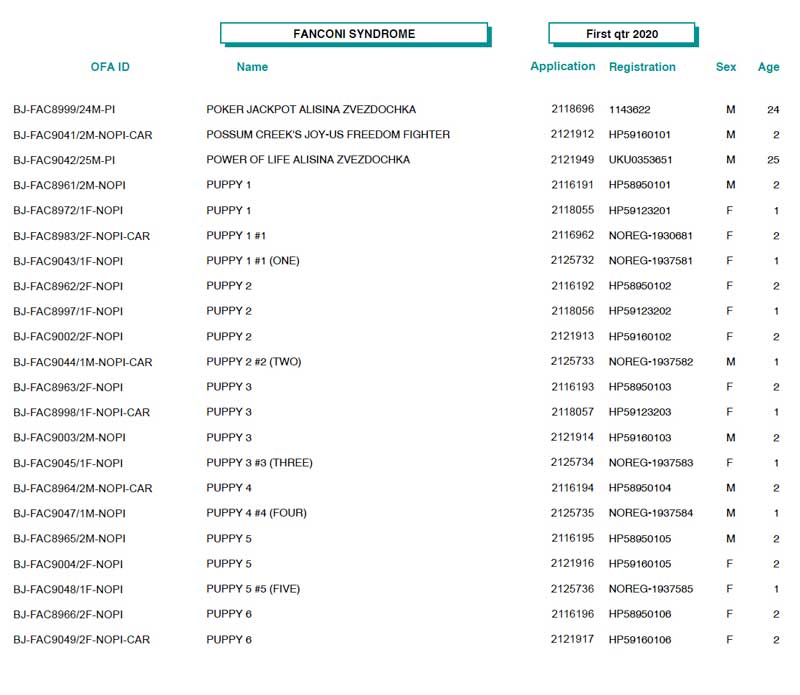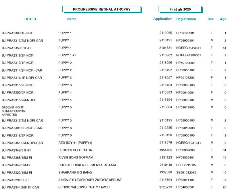 | *** OFA Operations Update *** The State of Missouri has extended the mandatory stay at home policy and closure of all non-essential business through May 3rd. This has a significant impact on the OFA’s ability to receive and process applications. Through a VPN, we have provided most of our employees with connectivity into the office which allows some level of business to continue through work at home activities. However, it will certainly not be ‘business as usual’, and turnaround times and service levels will be reduced during this time. Your patience is appreciated as we remain compliant with city mandated directives, and balance our operations with the health, safety and well-being of our employees. *** Update Regarding the OFA/University of Missouri DNA Tests *** As of Wednesday, April 15, the University of MO has granted permission to resume lab operations on a limited basis. With this announcement, the OFA will resume accepting orders. Please be advised, while new orders will be processed, turnaround time will continue to be affected as the majority of the OFA staff is working remotely, and the University of MO lab will have strict limits on the number of personnel allowed in the lab at any time. Both the University of Missouri and the OFA appreciate your patience as we balance operations with concern and safety for our employees. We continue to monitor the official guidelines and if there are any further changes or closures, they will be posted here. Again, thank you for your patience, and stay well! OFA Basenji Test Results (1st Quarter, 2020 - thanks to Jon Curby!)