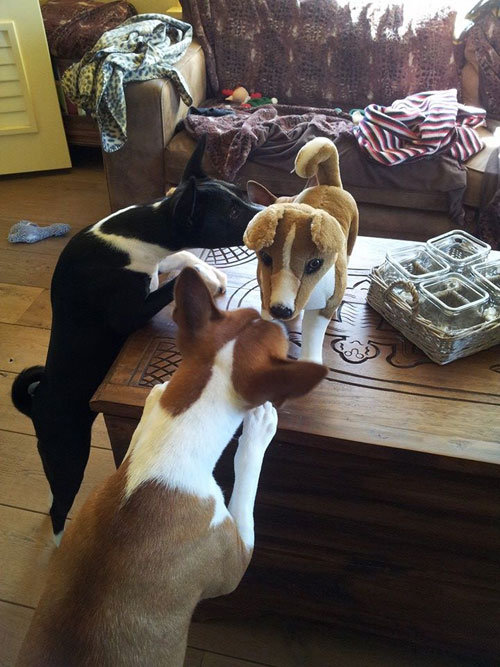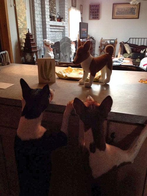 Donna Hess, "My new Basenji arrived today and she is beautiful!! Nora identified it as one of her own right away, smarty pants she is. But then she realized it was a fake Basenji and she gave me a dirty look <VBG>" Terri Gavaletz called from No Cal to say she never wins anything, but guesses she just had, by the arrival. Says to tell all that she has no longer any email, but to give her a ring if you want to reach her