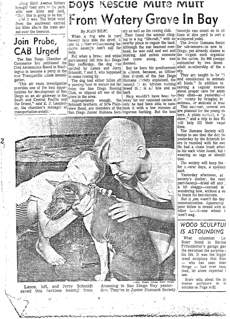 Basenji Rescue from 1967/submitted by Tamara Allen Dennis met a guy in taking pictures of hawks in our canyon. He recognized our basenjis, and told Dennis 40+ years ago, he and his brother rescued one from the waters in San Diego - he sent us a copy of the article. Kind of cool write up. (His name is Lance Schmidt)