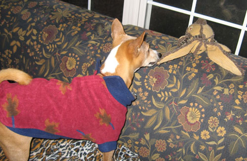Thanks to Tamara Allen - and the "elfishly yours" crew for sorting out our gift exchange. Everyone ENJOYed themselves! Fiddle & Liner show you how nicely they share. True there were 4 balls, but this is the BEST one. Peggy Pick Santa Paws found our house and brought us a great toy that makes really cool crinkly and squeaky sounds. Our mom will Soon (hint, hint Mom) send you some photos of us playing with this most excellent bunny. Thank you! (See! We really were good.) Ivan and Dasa Here are photos of Ivan and Dasa with their excellent bunny toy. Dasa is very cautious about approaching new things, but once she realized the bunny was not dangerous, she was really interested in the bunny’s tail. That was the best! Ivan spied the bunny, grabbed it to explore and was fascinated by the sounds; crinkly ears, how cool! He then flung the bunny about and took it up on the back of the couch for a while.