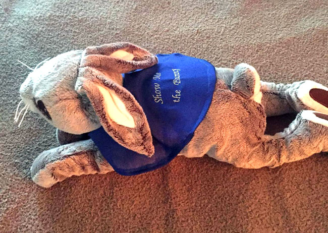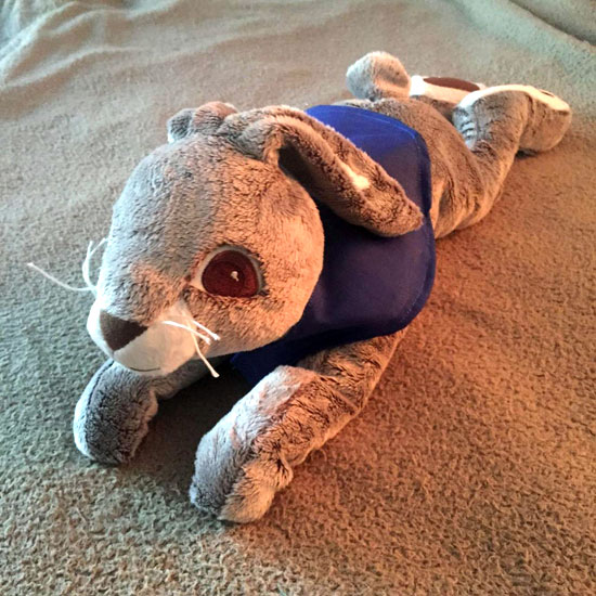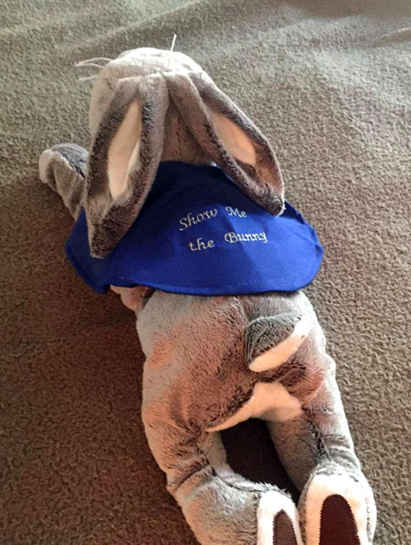 IKEA hare, wearing an embroidered racing jacket, by Lisa Stewart