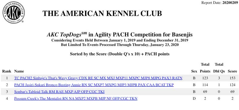 AKC TopDogs in Agility MACH Competition for Basenjis for 2019 RVW Dogs #s 1 & 5!