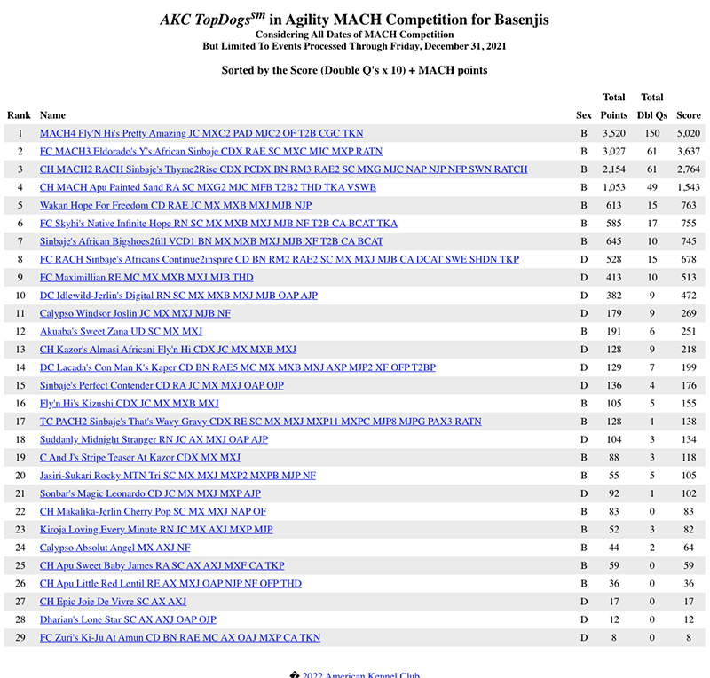 Lifetime AKC TopDogs in Agility MACH Competition for Basenjis.
