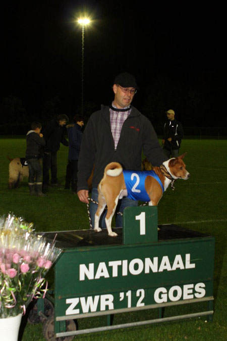 To celebrate we participated in our 1st Basenji international oval-race in Beringen, Belgium. A full course with 6 B’s (Gobu – Jaya – Ango – Bas – Ch’ami – Moyo). We had a great weekend, plus excellent feed-back from the people who had never met our breed before. Bas won this race!