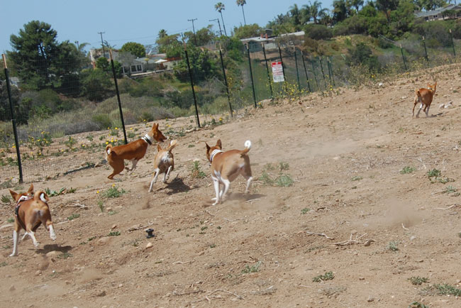 Every week we held our mini boot camp for lure coursing in our back yard. When April came, our friends Ashley and Joe Pistorio came to San Diego for a visit and brought their three basenjis. None of them had participated in lure coursing before. We called it our Rip Van Wrinkle West meet up. We ran six basenjis (well, Gloria at 14 + sat out after a few yards) and everyone had a blast. A freight train of basenjis barreled around our make shift course with pure joy on their faces. After a few runs, we had six very happy very tired basenjis.