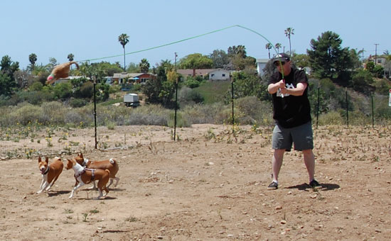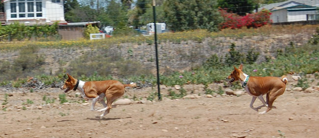 Dennis then restarted conversations with the owners of the vacant canyon property behind our house to see if he could purchase the unbuildable land. Six months later, Tippy was proficient with the whip – seemed to enjoy it – and the canyon owner agreed to let us fence off a 250 foot long stretch of the canyon behind our back yard. He said he has dogs too and understands their love to run, so he gave us blessings to use it as much as we want to run our basenjis. Now we had some real space that would be secure to run the dogs and work with them!