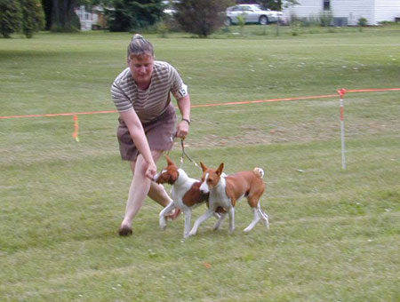 Carol Mount (judging RVW Match in 1997 or 8) & S K-M with Niner and her son, Trill.