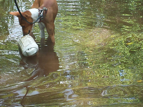 • Exterior: The target odor is concealed on or in an object in an outdoor search area--this requires the dog to locate the scent despite changing airflow patterns, weather conditions, and natural distractions.