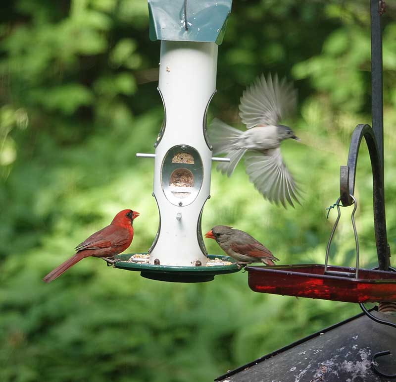 ©Susan Kamen Marsicano, mated pair of Cardinals, Titmouse in flight.