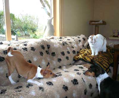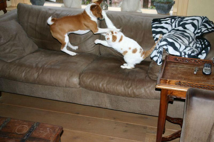 Yvonne 't Mannetje “HOW OUR DOG(S) ENTERED OUR LIFES” Ch’ami came into our lives to safe Chica’s life (our beloved cat). Her brother Jordi suddenly died 3 weeks shy of his 8th birthday. The two of them were very, very close. Jordi protected his sister against “enemies” in the neighborhood while the little coward was hiding under the couch. He also spoiled her rotten by washing her thoroughly every night, holding her tight in his arms. There was this special “brand” of mice Chica loved a lot, so being the gentlemen he was Jordi regularly went out and brought her home one, making a special sound to alert her. When she was outside herself, he just left the mouse –dead or alive- on the kitchen rug, thinking she would find it later. …. We gave Chica the opportunity to say her last goodbye to her beloved brother, but she was in total denial. The following days, weeks she wouldn’t eat. We brought all her favorite food in little portions to her, without success. She lost a lot of weight. Chica developed a nervous tic. She licked her belly as if she wanted to lick the grief away. This resulted in her having a bald belly. We fought very hard to get her out of her depression, but she seemed to have lost interest in life. Kees and I understood she needed a companion, but she was hostile against other cats. We thought of a dog, but had no clue as yet about a breed that would fit us all. Then we came across this poster in a magazine with drawings of some special breeds and we immediately noticed the Basenji, wanting to get to know more. In our search on the internet we found the Apu page with the Basenji test. I was ROTFL when I read that. So I guessed I passed that test. The quote on top of this page, “The basenji is one half cat & three quarters monkey”- by Nicholas Marsicano, made us shout out “yes, this must be our breed”!! We visited several breeders and one dog show. The 1st Basenji pack we met in person made us fall in love with the breed. Then we were on the waiting list for a puppy. I was over the moon when I was invited to witness the birth and cried when Ch’ami was born. It was decided that a male puppy would increase the chances that Chica would also fell in love with a basenji. The preparations began. Every puppy visit we brought smelly stuff from Chica over to the puppies and took some smelly puppy stuff back home to present it to Chica. She kept it close to her, it got her interested. We bought all the dog stuff very early, and one thing at a time was put in its place to let Chica get used to it. In the end she was as excited as we were, she understood that “something” was coming to live with us. She had no clue as yet what that “something” was. The night before we could pick up our puppy I wasn’t able to sleep, being very nervous and worrying sick what to do when things wouldn’t work out between the 2 of them. I needn’t to have worried. We had named our puppy Chamchela (hurricane) and decided for his call name Ch’ami. “Ch” is from Chica, and “ami” is French for friend. Chica’s friend. And that he was!!! The first days after Ch’ami entered our home Chica was afraid to walk on the floor. She would pick a safe place somewhere high up with a good puppy view, enjoying everything Ch’ami did. She could stare at him for minutes when he was asleep, creeping towards him to be able to smell him. Within days they fell in love. And Chica felt good, she gained weight again, stopped the nervous licking and her hair grew back. She showed him what a cat is capable of doing, and he loved it, and tried to copy everything. That’s probably why he likes to jump on the dinner table.